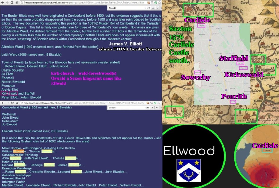 James V. Elliott on origins of Elliot of Ellwood (Elwold, Elwould) variant origin may be Cumberland.
